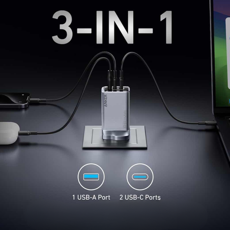 يجمع شاحن Anker Prime 100W GaN بين تعدد استخدامات المنافذ الثلاثية في تصميم صغير الحجم - مما يوفر شحنًا عالي السرعة لجهازين كمبيوتر محمول وهاتف في وقت واحد، كل ذلك مع كونه أصغر حجمًا وأخف وزنًا من محولات 100 واط التقليدية.